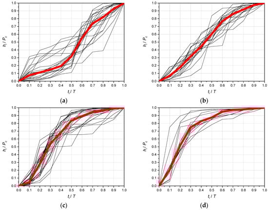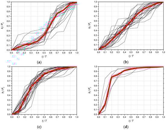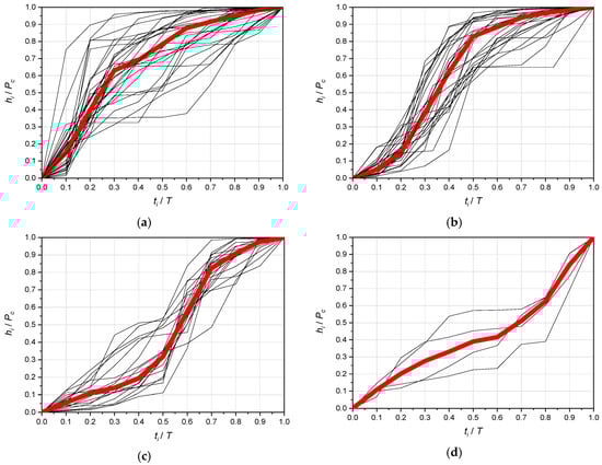 Dimensionless rainfall mass curves with a median for four clusters separated by the k-means method: (a) Cluster No. 1, (b) cluster No. 2, (c) cluster No. 3, and (d) cluster No. 4.