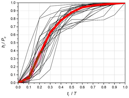 It should be noted that discrete median values in Figure 10 were determined for interval increments of precipitation in contrast to the median illustrated in Figure 9, where these values were determined on the basis of total mass curves. This leads to some differences in the relative values of the height interval peaks such as the peak value hi/Pc, according to sum curves. It falls from the level of approximately 0.29 to approximately 0.25 by interval increments. There are no differences in the peak location itself: r = 0.2ti/T, i.e., in one-fifth of the duration of rainfall.