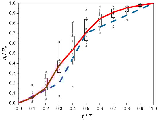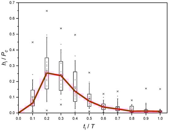 In Figure 10, the ranges of changes in measured relative interval values (Δt = 0.1T) of the precipitation amount (hi/Pc) are depicted using box charts that include the pictogram information on the location, dispersion, and shape of the empirical distribution of the studied size. The shape of the box (its range) is shown by the shape of the graph, covering the entire range of data (from the lowest to the highest value). The length of the box is equal to the quarter (quartile) range, i.e., the difference between the first and third quartiles. The quartile is, therefore, one of the measures of the location of given observation values. The first quartile (bottom edge of the box) contains 25% of observations. The second quartile divides the observation collection in half, which corresponds to the median. The third quartile (upper edge of the box) divides the observation dataset into two parts, respectively, with 75% located below this quartile and 25% located above. In Figure 10, the whiskers are limited to the 10% and 90% percentile of the data set (which are identified in the literature by Bonta [] and Huff [,,], with confidence intervals at 10% and 90%, respectively).