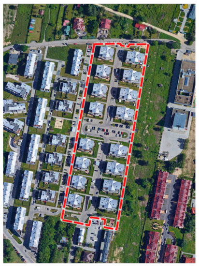The analyzed area is located in the northwestern part of Cracow, District IV Prądnik Biały, between Chełmońskiego and Piaskowa Streets. The nearby area is characteristically made up of low-rise buildings. villas, terraced, and single-family houses. The northern neighborhood has green areas and the stream of Sudół. The satellite image below (Figure 1) presents a detailed area of the analysis based on which it is possible to determine the type and character of its development.