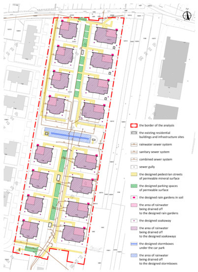 The post-completion runoff value increases nearly five-fold in relation to the area from before the completion of the estate. As a result of the change in land development and its sealing degree, runoff increased by 6570 up to 8261 m3/year (Table 4).