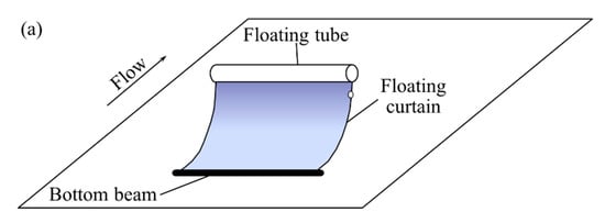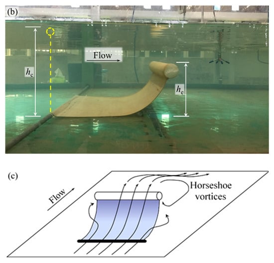 A flexible flow deflector is proposed, which is an underwater structure for flow pattern modification (Figure 1a,b). It is composed of a bottom beam, a flexible curtain, and a floating tube. The bottom beam serves as a foundation for the whole structure and can be made of reinforced concrete, geotextile tube, or other heavy materials. The flexible curtain is a geotextile sheet that is attached to the beam on the bottom edge and the floating tube is attached on the upper edge. The floating tube is a light or inflatable structure manufactured with materials like foamed plastic. When the flexible flow deflector is deployed in a steady current, the upper edge of the curtain is extended upward and inclines to the downstream side due to the buoyancy of the floating tube and the flow drag force. Therefore, the flexible deflector partially blocks the cross section of channel in the lower part of flow. Thus, the approaching flow is diverted to the lateral sides, or climbs over the top of deflector. At the leeside of the deflector, a three-dimensional horseshoe vortices system forms due to the blockage effect of the deflector (Figure 1c).