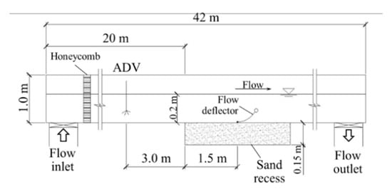 The experiments on local scour were conducted in a water flume at Zhejiang institute of hydraulics and estuary, China. The glass-sided flume is 42 m in length, 4.3 m in width, and 1.0 m in depth (Figure 2). A honeycomb structure was installed at the entrance of the flume to stabilize the current. The maximum flow depth in the flume is 0.6 m, and the maximum flow rate is 0.8 m3 s−1. A sediment recess of 3 m in length and 0.15 m in depth was located in the center part of the flume. Four outer-sides and the inner-bottom of the recess, and the bottom of the flume were covered with impermeable concrete. Natural sand was taken from the Qiantang river estuary site and applied in the test. The median diameter of sand d50 = 0.34 mm and the geometric standard deviation σg = (d84/d16)1/2 = 1.48. The velocity in the flume was monitored with an acoustic doppler velocimeter (ADV).