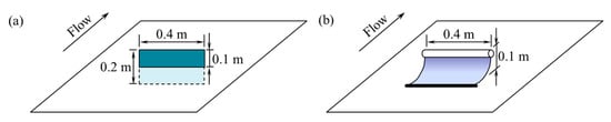 For the purpose of comparison, a control test was conducted with a rigid deflector under the same flow condition, the same shape configuration and the same wide and effective height as that of the flexible deflector. The rigid deflector model was a 0.4 m wide and 0.2 m high plastic plate. Half of the plate was buried in the sediment, and thus the effective blockage area of the rigid model deflector was 0.4 m in width () by 0.1 m in height () (Figure 3). The flexible model was composed of a bottom beam, a flexible curtain, and a floating tube. The bottom beam was a 0.4 m long steel bar with a diameter of 10 mm, being fixed on the bed with short pillars. The width of the flexible curtain of polyester fiber was m. The original height (i.e., in full stretched condition) of the flexible curtain was hc = 0.3 m. Under the test condition of flow velocity of 0.35 m s−1 () and water depth of 0.2 m (), the effective height of the flexible current he = 0.1 m (Figure 3). Thus, the widths and effective heights of the rigid and flexible models were identical. The single deflector model was located at the center of the recess in each experimental test (Figure 2).