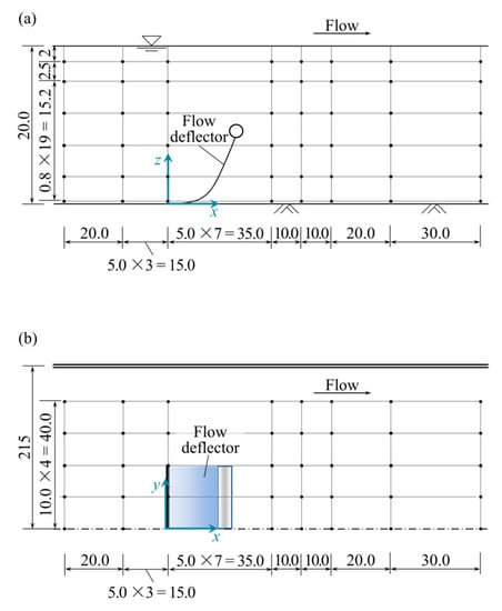 Figure 4 shows the locations of the flow velocity measuring points, where the x axis is in streamwise direction; the y axis is in the lateral direction, and the z axis is in vertical direction. Because the flexible deflector was placed in the cross-sectional middle part of the flume, and the flexible deflector has no significant spanwise sway due to the stable effect of two rigid beams at its bottom and up ends, the time-averaged flow fields and the scour pattern at the two spanwise sides to the cross-sectional center of the flexible deflector will be systematic. Therefore, only a half of the spanwise of the flow field and the scour pattern in the horizontal plane was observed.