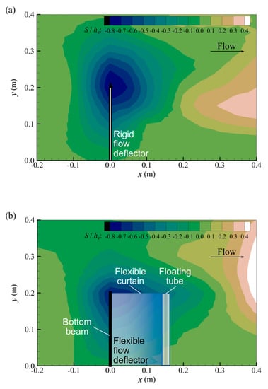Figure 5 shows the scour pattern near the rigid and flexible flow deflectors, where the bed elevation S is normalized as S/he. Remarkable scour appeared at the edge of both flow deflectors (Figure 5). The scour depth, scour area, and scour volume were compared between the rigid and flexible cases. Compared with the control experimental test of the rigid deflector, which has a maximum scour depth of 8.2 cm, the maximum scour depth in the flexible deflector test is 7.0 cm, which decreases by 14%. The average scour depth decreases from 2.3 cm in rigid deflector test to 1.8 cm in the flexible deflector test, which decreases by 22%. The detailed scour information is given in Table 1.