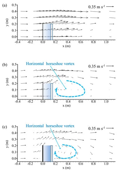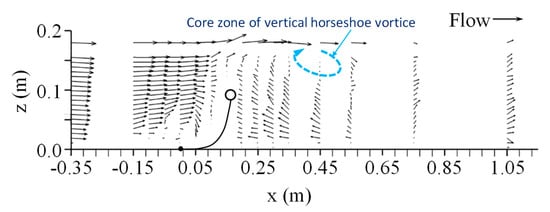 Figure 7b,c also show that a horizontally rotating vortex was observed between x = 0.2 m and 0.6 m. As the deflector and the approaching flow was supposed to be axisymmetric, two vertical vortices formed immediately downstream to the deflector, one clockwise and one anticlockwise. The vortices were induced by the bypass flow on two sides of the deflector and the low-pressure zone on the leeside of the deflector.