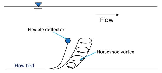 Underwater engineering structures, such as breakwater and cylinder in coastal areas [,,], are usually exposed to the toe-scour damage and instability risk. To protect these underwater structures, rigid flow deflectors are widely used in the upstream section of these engineering structures. The working mechanism of flow deflector is to modify and optimize local flow pattern, leading part of the flow over the protected structures, and then reducing the scour damage risk to them. The rigid flow deflector is also used to regulate flow routes in channels and in fish habitat restoration areas. However, due to obstacle effect, horseshoe vortices are usually induced at the leeside of underwater structures and causes local scour at its toe part []. This local scour is also considered as a side-effect of deflectors, because it may trigger structural failure of the deflector by itself.