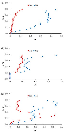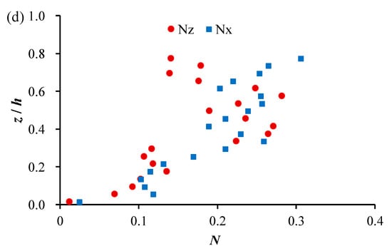 Figure 10 shows the vertical turbulence intensity distribution along the streamwise centerline of the flume. The relative turbulence distribution N is calculated as follows. In Figure 10, the vertical axis is normalized with the flow depth h as relative depth z/h.