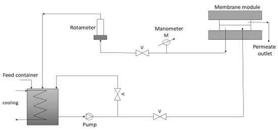 Ultrafiltration is especially dedicated to drinking water production because colloids, particulates, macromolecules, and pathogens are removed in this process. It is also a suitable process to purify effluent after biological treatment as this effluent contains bacteria, particles of organic matter, and suspended solids. Ultrafiltration was carried out in the lab, using a scale cross-flow configuration equipped with a plate-and-frame membrane module SEPA CF-NP (GE Osmonics, Minnetonka, MN, USA) as seen in Figure 1. Three ultrafiltration membranes were used in separate processes. Membrane properties are presented in Table 2. Before each experiment, the clean water flux was determined using ultrapure water. The process was operated at a constant pressure of 5 bar and a constant temperature of 22 ± 1 °C and a constant velocity of 1 m/s with continuous dosing of SBR effluent to the feed tank. Each filtration run consisted of three cycles including 60 min of filtration followed by forward flushing with ultrapure water during 60 s. The volume of permeate was monitored in order to determine the permeability from the following equation: