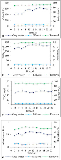 It was found that the easily biodegradable compounds expressed by BOD5 were removed in 99% of cases, and the average concentration in the effluent was 4 mg/L (Figure 2b). Similarly, a high reduction was recorded for TOC and absorbance, i.e., 91% and 76%, respectively (Figure 2c,d). Anionic and nonionic surfactants were reduced by 97% and 100%, respectively (as seen in Table S1 in the Supplementary File). In the study [22], the removal efficiency of the anionic surfactants was about 80% in the submerged membrane bioreactor. This is due to the fact that non-ionic and anionic surfactants are readily biodegradable under aerobic conditions [23,24,25].