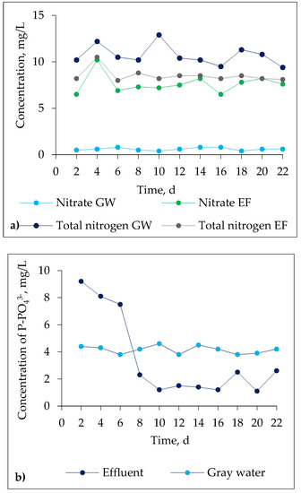 It was shown that the degree of pollution removal was high, and the values of the quality parameters in SBR effluent did not exceed the permissible values included in the currently in force in Poland, Regulation of the Minister of the Environment on the conditions to be met when discharging wastewater into water or soil [21]. Over the whole experimental period (22 days), the SBR system reduced COD by around 92%, from an average value of 543 mg/L (influent) to 44 mg/L (effluent) (Figure 2a). Fountoulakis et al. obtained a similar result in their studies [22]. More specifically, the removal of COD was approximately 87%. Such, a high removal was also obtained in studies on grey water purification in a membrane bioreactor operating in a flow-through system [3], where the COD reduction degree was 88%.