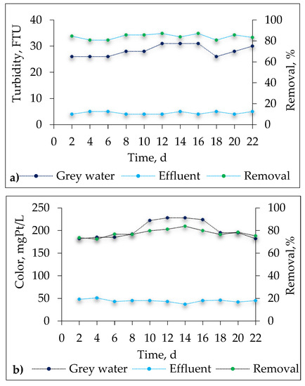 Figure 4 and Figure 5 show the treatment efficiency of the SBR system with respect to the changes in the color and the turbidity. From these results, it is clear that over the whole experiment, the efficiency of the SBR system in terms of color and turbidity was at a constant high level. During 22 days of continuous SBR system operation, the color of grey water decreased from an average value of 201 mgPt/L to 44 mgPt/L, which corresponds to an average removal of 78%. Meanwhile, the average grey water turbidity decreased from 28 FTU to 4 FTU corresponds to an average removal of 84%.