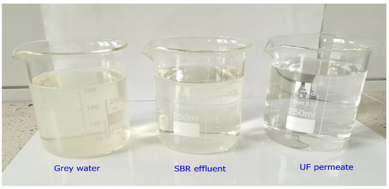 Numerous approaches, including low and high pressure-driven membrane techniques [9,10,11], coagulation [12,13], biological processes, and membrane bioreactors [3], have been proposed for the treatment of grey water. These technologies vary in both complexity and performance. For example, Li et al. recommended the employment of an aerobic treatment coupled with membrane filtration or an aerobic treatment with sand filtration, with disinfection as the last step for both systems [8]. Similarly, Ding et al. suggested applying a system that combines membrane filtration with biological treatment in a gravity-driven membrane filtration system. In this technique, the fouling layer attached to the membrane stabilizes a flux and improves the treatment effects due to the microbial activity of biofilm [14]. From these studies, it is clear that grey water requires both biological and physical treatment to meet non-potable reuse standards. Aerobic biological processes are effective to remove organics from grey water. Physical processes, particularly membrane filtration, are recommended for polishing effluents from the biological treatment step [9,15]. Ultrafiltration (UF) retains bacteria, suspension, colloids, natural organic matter, and partial micropollutants such as pharmaceuticals and personal care products. However, the efficiency of ultrafiltration in the removal of individual pollutants depends on membrane type and its properties such as molecular weight cut-off (MWCO). Membrane properties such as contact angle and zeta potential play an important role in the fouling behavior and hydraulic performance of the system [16]. Membrane fouling results in a permeability loss due to the increase in hydraulic resistances in the filtration system, especially in the case of porous polymer membranes. There are many studies reported in the literature that aimed at mitigating the fouling by selecting the most optimal operational parameters for ultrafiltration such as transmembrane pressure, velocity, temperature, or developing a cleaning method. [17,18,19]. On the other hand, they do not consider the effect of structure and surface properties of membrane i.e., MWCO and contact angle on fouling behavior. Another issue is that most of these studies were conducted for artificial grey water. While artificial grey water provides useful information for model development, it does not reflect real conditions, and the composition affects the process significantly.