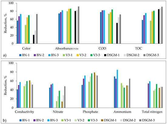 Reduction values of organic (a) and inorganic (b) parameters during the ultrafiltration of SBR effluent. Each bar corresponds to the filtration cycle 1–3.