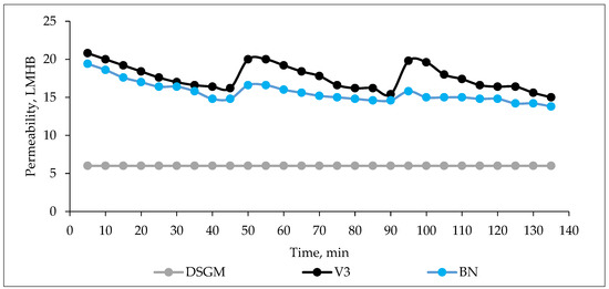 Permeability loss as a function of time of UF for different types of membranes. Ultrafiltration with DSGM membrane was performed without forward flushing due to constant permeability.