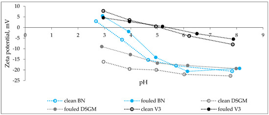 Hydraulic performance of membranes was evaluated by permeability loss as a function of time. As seen in Figure 7, the permeability decreased gradually for BN and V3 membranes, while for DSGM, permeability was constant along the ultrafiltration. In other words, fouling was not observed for the DSGM membrane. This finding is very important in the context of membrane lifetime and reducing operational cost. Similarly, Acero et al. reported that UF membranes (with higher MWCO) revealed higher fouling than NF membranes (with lower MWCO) [42]. It can be explained by different surface properties of given membranes, such as hydrophilicity/hydrophobicity and surface charge (zeta potential curve and isoelectric point). The contact angle and isoelectric points of clean and fouled membranes are listed in Table 4. Zeta potential curves for clean and fouled membranes are presented in Figure 8. Owing to the lowest contact angle and strong negative surface charge, the DSGM membrane had the best antifouling properties. On the contrary, the surface of BN and V3 membranes was much more hydrophobic, and thus more prone to adsorb the feed components. Some authors reported a high importance of membrane hydrophilicity and negative charge for fouling mitigation in ultrafiltration [43,44,45] treating water or wastewater.