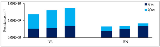 In order to investigate this further, the hydraulically reversible and hydraulically irreversible resistances were calculated. As seen in Figure 9, the total fouling (sum of reversible and irreversible resistances) was higher for the V3 membrane. However, considering the proportion of reversible and irreversible resistances for these membranes, it is clear that fouling behavior for these membranes exhibited the opposite trend. More specifically, a significant proportion of the increase in resistance for the V3 membrane was hydraulically reversible, while hydraulically irreversible for the BN membrane. Reversibility/irreversibility of fouling depends on the surface properties of membranes. It is in good correspondence with changes of course of zeta potential curves and shift in isoelectric point for clean and fouled membranes. Membrane V3 with the lower negative charge was more sensitive to fouling overall than the BN membrane. However, for the BN membrane, we observed the higher shift in isoelectric point (from 3.01 to 3.55) than for V3 (from 5.1 to 5.25) indicating a persistent change in BN membrane properties caused by irreversible fouling.