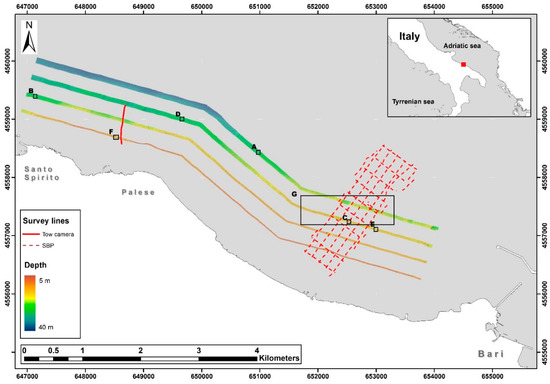 High-resolution acoustics data ground-truthed by video records were obtained by ship-based research surveys performed within the framework of BioMAP project (BIOcostruzioni Marine in Puglia, -P.O. FESR 2007/2013) that promoted actions in order to map and monitor C habitats along the Apulian shelf (southern Adriatic margin and northern Ionian margin, Mediterranean Sea) [27]. The survey has been carried out using a small research boat (Calafuria ISSEL, property of CoNISMa) in March and April 2013, acquiring 16 nautical miles of MBES survey lines, covering the seafloor over an area of 1.7 km2, at depths ranging from 5 to 40 m and using a Teledyne RESON SeaBat 8125 (455 kHz) MBES (Figure 1). Teledyne PDS2000TM software was used to acquire and process bathymetric data producing very high-resolution DEMs (0.5 m × 0.5 m). The correct position of the acquired data has been assured by a Hemisphere Crescent R-Series dGPS, and an IXSEA OCTANS motion sensor and gyro. Water sound velocity was obtained by a Valeport MiniSVS sound velocity sensor and by a Teledyne Reson SVP15 sound velocity profiler.