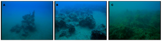 Examples of underwater images of Coralligenous build-ups made by the trawled camera. Following the classification proposed by [11]: (A) Discrete Relief, (B) Hybrid Bank and (C) Tabular Banks.