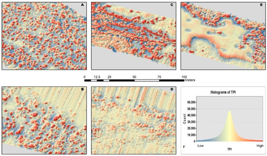 Topographic Position Index (TPI) maps, the color scale applied to the map indicate TPI value (low value in blue and high value in red) for the entire bathymetric dataset: (A–E) refer to the boxes in Figure 1, (F) histogram of the distribution for TPI value.