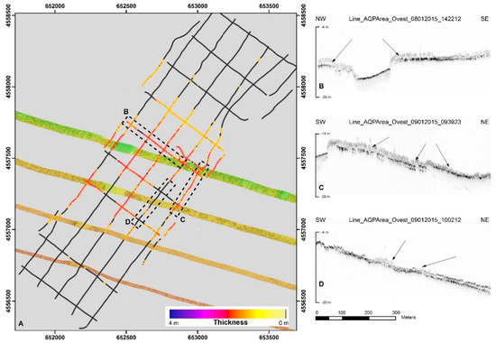 (A) Thickness map of the C build-ups calculated using SBP interpretation. (B–D) profiles represent examples of C echotype in the area (black arrows).