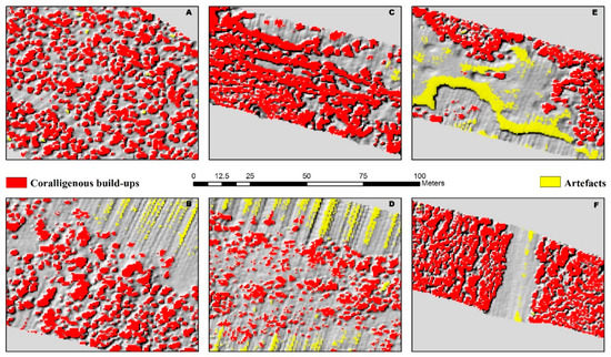 Result from geomorphometric analysis. (A–F) refer to the boxes in Figure 1. Red polygons represent coralligenous build-ups extracted, polygons in yellow are examples of artifacts filtered from the study.