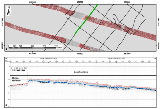 (A) SBP dataset with a selected profile (in green) crossing red polygons representing C build-ups obtained from the geomorphometric analysis. (B) Selected SBP profile showing in detail the echotype related to C occurrences and the erosional truncation that marks the top of the underneath sequence (blue horizon). Blue and red X represent intersect profiles.
