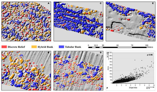 Distribution of C features extracted with TPI colored by morphotypes, following the classification proposed in [11]. (A–E) refer to the boxes in Figure 1, they are details from the entire dataset and show: Red polygons for discrete relief, yellow polygons for hybrid bank and blue polygons for tabular bank. (F) Scatterplot indicates the direct correlation between area and SI, Spearman’s ρ = 0.96.
