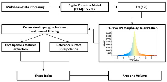 The results of this work illustrate the importance of combining high-resolution acoustic techniques and geomorphometric analysis in order to have a preliminary quantitative characterization of C habitat distribution. To our knowledge, this is the first attempt to quantify the volume of Mediterranean algal reefs. Conventionally, segmentation of MBES data sets into defined submarine landforms is carried out manually despite the process might be highly subjective, slow and potentially inaccurate [43,44]. On the contrary, geomorphometric techniques (e.g., terrain attributes, feature extraction, automated classification) can objectively characterize seabed terrain from the coastal zone to the deep sea [45,46,47,48,49,50,51,52], although a common and standardized technique for automated seabed classification has never been developed [53]. Only recently other works successfully develop object-oriented methods applying object-based image analysis (OBIA) or considering a complete set of remote data in order to precisely characterize targeted landforms on the seabed that will document the extension of biodiversity hotspots [52,54,55,56]. In this study, we considered a C build-up as a discrete feature in both two and three-dimensional spaces in order to use a geomorphometric parameter for object-oriented modeling and extraction from the seafloor. The method developed here (Figure 8) intentionally chose a geomorphometric algorithm commonly available in existing terrain analysis software to achieve maximum applicability.