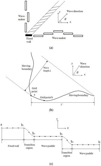 A sketch map of the moving boundaries when simulating oblique waves by this model is shown in Figure 1b. The movements of the boundary mesh points should mimic the movements of a physical segmented multidirectional wave-maker system. The displacement or velocity of wave-maker paddles is required to control the boundary mesh point movements at each time step. The signals to control the boundary movement can be obtained from the displacement series of the physical wave-maker during the experiment. However, as stated above, the time steps in this model will be changed according to the calculated Courant number, so only the approximate displacement can be obtained by interpolation. In this paper, the displacements of the boundary mesh points are calculated at every step by theoretical formulas, which is more effective and accurate. The specific formulas for boundary mesh point movements for different kinds of waves will be discussed in Section 3, Section 4 and Section 5.