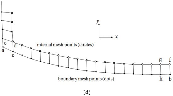 in which θmax and θmin are the maximum and minimum interior angles of the quadrangle a–c–d–e in degrees. The aspect ratio is the ratio of the longest and shortest side lengths of the quadrangle. If the skewness is smaller than 0.8 and the aspect ratio is smaller than 40 [21], the grid cell is in good condition. Otherwise, the boundary mesh points should be redistributed by solving Laplace equations. For the boundary a–c, the grid points can be redistributed as: