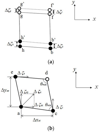 where γ is the diffusion coefficient, up is the motion velocity of grid point, x is the position of mesh points and the superscripts n and o represent new and old time step, respectively. The diffusion coefficient γ can be defined as a field, whose values are the reciprocals of the distances with the nearest wave generation boundary. With this approach, the movements of the mesh points near the dynamic boundary will be larger than the internal mesh points. Take cell b–f–g–h in Figure 1d as an example, the cell moves to b’–f’–g’–h’ at the next time step, as shown in Figure 2a. The movement of the internal mesh point is smaller than the boundary mesh point movement (∆ζg < ∆ζh, ∆ζf < ∆ζb). The longer the distance with the moving boundary, the smaller the displacement is. So, the movements of the boundary mesh points pass to the internal mesh points decreasingly, and the deformation of boundary grid cell can be balanced by the internal grid cells. Further, point b and point h replicate the movements of wave-maker, i.e., move perpendicular to the x-axis. Since the time step is very small under the control of Courant number, the displacement differences (∆ζ) between two time steps are small and the cell has no topological deformation.