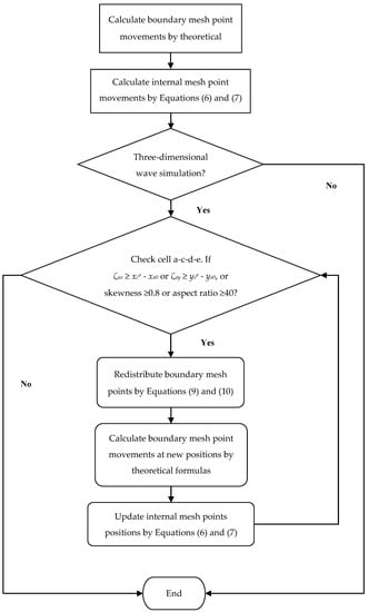 For the grid points on boundary a–b, the redistribution algorithm only changes the x-coordinate, while the displacements at new positions can be calculated by wave generation theory. The grid points on boundary a–e are also redistributed by applying this method on y-axis. After the boundary mesh point redistribution, the positions of internal mesh points can be updated by Equations (6) and (7). These procedures can be repeated several times until the grid cell a–c–d–e fulfills the above conditions. Generally, one cycle is enough to redistribute the grid points well, so the increased simulation time by this procedure is acceptable. The flow chart of the dynamic mesh algorithm is shown in Figure 3.