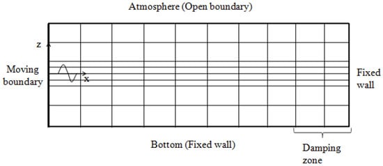 To avoid wave reflections, a damping zone is set up near the outlets of the wave tank. In this study, the linear form damping coefficient is adopted based on the comparison results of Han [22]. The additional source term for wave damping in Equation (2) is denoted as: