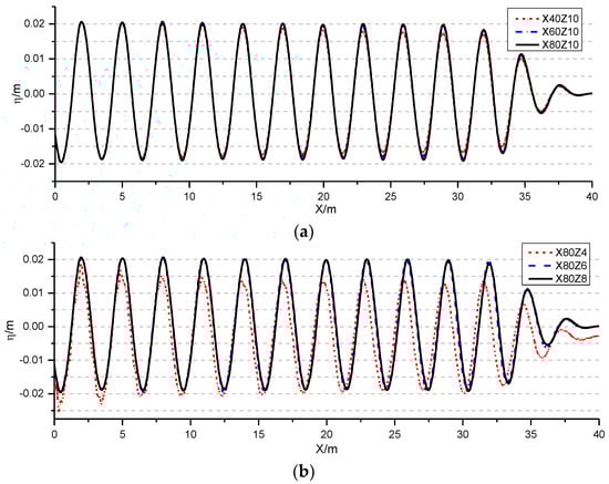 Snapshots of water surface profiles at t = 40 s for regular wave simulation (H = 0.04 m, T = 1.5 s, d = 0.6 m). (a) Fixed mesh number per wave height 10, variable mesh number per wavelength and (b) fixed mesh number per wavelength 80, variable mesh number per wave height.