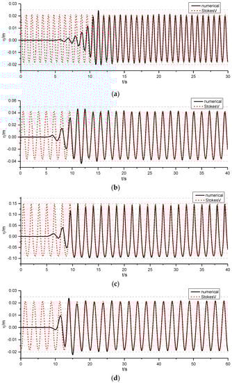 Further, some non-linear features appeared in the generated wave profiles. As shown in Figure 5, the wave crests and wave troughs were asymmetric, similarly with high order Stokes waves. This characteristic was consistent with the waves generated in the laboratory, which makes the moving boundary method a better choice to replicate the physical wave flume in a numerical model. In Figure 6, the numerical results for four different waves were compared with the analytical solutions at the positions 10 m, 10 m, 10 m and 20 m away from the wave generation boundary, respectively. The wave parameters and mesh sizes are listed in Table 1 for the four cases. The wave simulated in case 1 was the deep water wave and case 2, 3 and 4 were the waves in intermediate depths. The water steepness (H/L) of case 3 was 0.08, which aimed to test the ability to generate and absorb the wave with large wave steepness. The analytical solutions shown in Figure 6 were calculated by fifth-order Stokes wave theory [24] since the wave parameters were in the range of Stokes wave [25] and wavelengths were shorter than ten times the water depth [24]. The root-mean-square error [26] between the numerical results and analytical solutions during the last fifteen wave periods of the four cases are listed in Table 2. In general, the numerical results are shown to be in good agreement with the theoretical solution. The biggest root-mean-square error and relatively significant attenuation occurred in the large wave steepness case (case 3) because of the inevitable numerical dissipation. Besides, the deviations between the numerical results and theoretical solutions were also due to the influences of spurious free-waves with first order wave generation theory. Since this work aimed to replicate the ordinary physical wave-maker, the second-order wave-maker theory will be included in the future work.