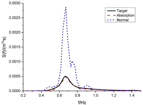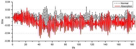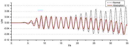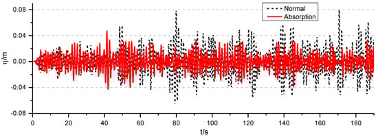 Similarly to Section 3.3, a 20.1 m-long wave flume without the damping zone was set up to generate irregular waves by both the normal method (without active absorption) and the adaptive absorption method. The water depth was 0.55 m. The spectral peak period was Tp = 1.5 s and the significant wave height was Hs = 0.04 m. The comparison of the surface elevations at the position x = 1.0 m is shown in Figure 13, while Figure 14 shows the displacement of moving boundary for both cases. Obviously, the surface elevations for the absorption case were much smaller than those of the normal case (Figure 13). The slow drift of the moving boundary (Figure 14) only occurred at the initial phase of the correction by the adaptive absorption, from about 20 s (when the first reflected wave reached the moving boundary) to 40 s. This is because when the active absorption switches on, the difference calculation for the reviewed position of the wave generator causes the slow drift due to the reflected wave front. However the following reflected waves become stable, thusly the drift keeps almost unchanged. The total drift was less than 0.02 m, which had no significant influence on the simulation. Figure 15 shows the wave spectra of the separated incident wave obtained by the separation method proposed by Goda and Suzuki [27] according to the measured waves for the two cases. The separated incident wave spectrum in the active absorption case was in good agreement with the target spectrum, which means that the active absorption system was effective in absorbing the reflective wave from the flume.