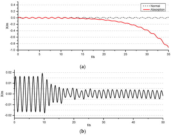 Displacements of the moving boundary. (a) Displacements of the wave-maker in the case of regular wave generation method (dashed black) and the active wave absorption method (red) before the low frequency correction and (b) displacement of the wave-maker with active absorption after low frequency correction.