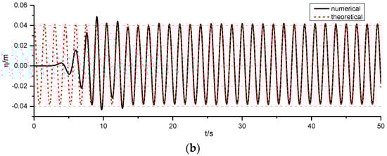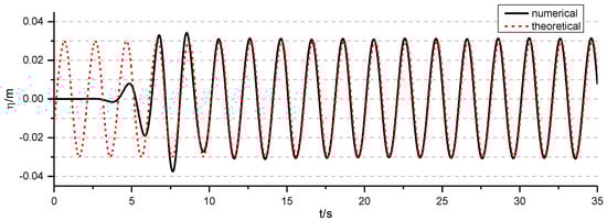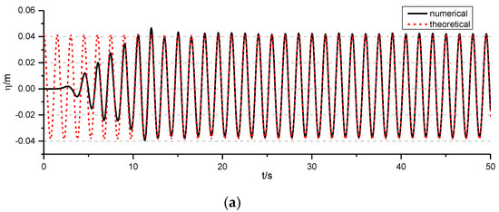 To validate the performance of the active wave absorption algorithm, a 9.01 m-long wave flume is established without damping zone. The incident wave height is H = 0.04 m, the wave period is T = 1.5 s, and the water depth in the flume is d = 0.6 m. Two cases are simulated with a total reflection boundary at the end of the flume. First, using the normal regular wave generation method (no adaptive absorption) and second, using the adaptive wave absorption method. Figure 7 shows the time histories of surface elevations at x = 9.0 m for the two cases. With the normal wave generation method, the water surface is unstable due to the superposition of incident waves, reflected waves and secondary reflected waves. When the active absorption is activated, the surface fluctuation becomes stable, but the mean water level gradually declines. This is because the wave flume is stretched due to the slow drift movement of the moving boundary. The slow drift comes from the zero frequency components in the displacement signals [31], and high-pass filtering can be used to circumvent this issue. In this work, the moving boundary displacement was corrected by an additional slow uniform motion, that is, to push the boundary to the initial position slowly. Figure 8 shows the displacements of moving boundaries before and after the low frequency correction, while the comparison between the simulated results after drift correction and the analytical solution are shown in Figure 9. The analytical solution is the superposition of the incident wave and reflected wave, under the assumption that the secondary reflection is totally absorbed. This result demonstrates that a stable standing wave is formed in the flume and the active absorption method is effective in the numerical model.