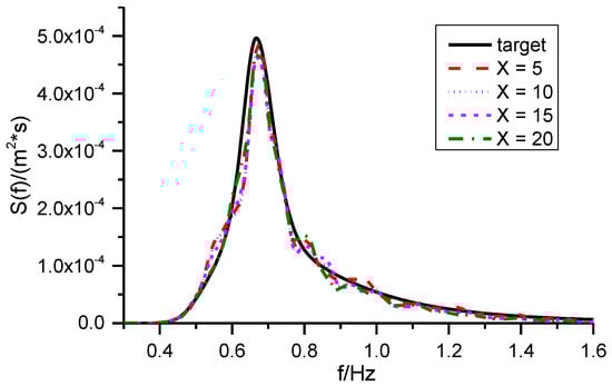 As stated above, an irregular wave is generated from the superposition of regular waves. The active wave absorption algorithm for irregular wave can also be achieved via a similar method. In Equation (22), the parameter D should be determined first. However, as it is related to the wave frequency, the representative frequency based weighted average method proposed by Liu et al. [30] was adopted in the present model. The movement of the moving boundary is directly given as: