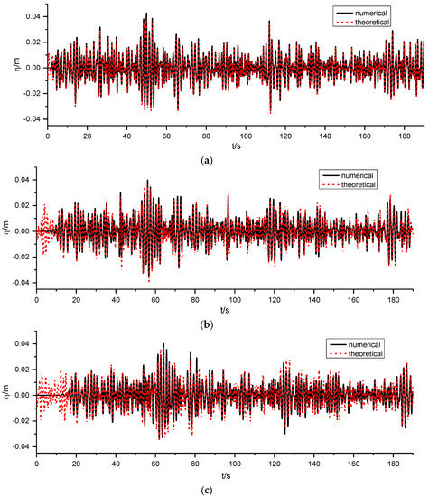 It should be pointed out, however, that outside the damping zone, the effective simulation area could be expanded to the whole wave tank for oblique wave simulations due to the L-type arrangement of the wave-maker system. For example, the midpoint of the computational domain (6 m, 6 m) will be out of the effective simulation area if the oblique wave is generated only by the moving boundary on the x-axis. Figure 19 shows the comparisons between the time series of surface elevations at the position (6 m, 6 m) and the linear theoretical solution. Good agreement can be observed from the figure.