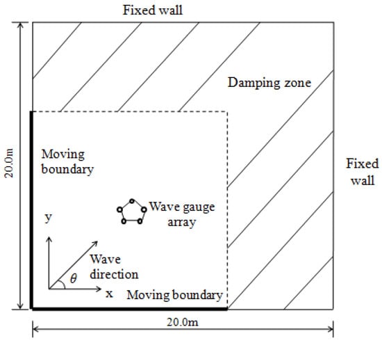 In three-dimensional physical model tests, oblique waves and multi-directional waves are usually generated by a segmented wave-maker system. In this paper, to expand the effective area of numerically simulated multidirectional waves, the L-type wave-maker system was considered. The arrangement of a typical L-type segmented wave-maker system in a physical wave basin is shown in Figure 1a. The fixed wall, as generally taken in real laboratory wave basin, was set at the corner of the two rows of wave-makers to prevent the collision between them. Theoretically, ordinary segmented wave-makers on one side (for example just on the left side) are capable of generating oblique waves with large incident angles, but in fact, the wave generation capability is related to the target wavelengths and the width of paddles. Besides, the bigger the generated wave angle (θ in Figure 1) is, the smaller the effective test area is. Therefore in the laboratory, the two-sided segmented wave-maker system (L-type arrangement) is a feasible method to expand the effective test area. Since the wave-maker paddle can be replicated by the moving boundary, a straightforward way to simulate the three-dimensional waves is to replicate the two-sided wave-maker system shown in Figure 1a.