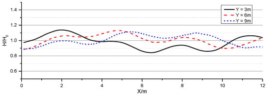 Ratios of the calculated wave heights and the target wave height along the lines y = 3 m, y = 6 m and y = 9 m.