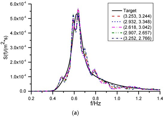 Frequency and directional spectra of the simulated results and the corresponding targets. (a) Frequency spectra and (b) directional functions (corresponding to the peak frequency fp).