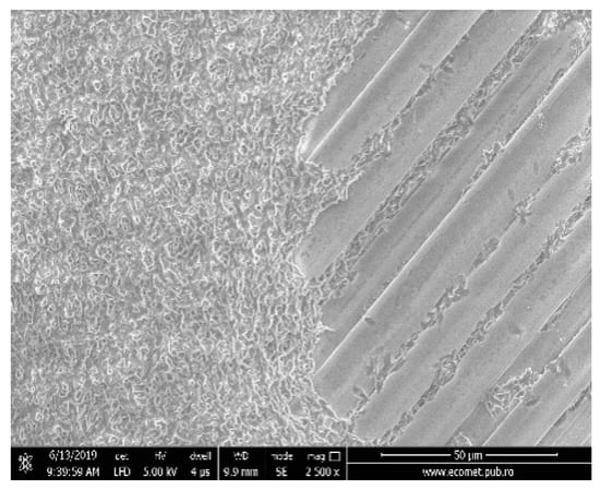 Before electrospinning process the surface of all materials was painted (covered) with PLA solution as prepared above. This technique will assure the better adhesion of electrospun nanofibers onto fiberglass surface. The Figure 1 shows the scanning electron microscopy (SEM) image of initial fiberglass membrane as alignments (right side) before to be covered with PLA solution (left side).