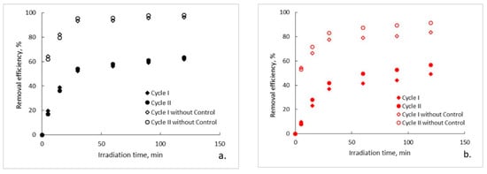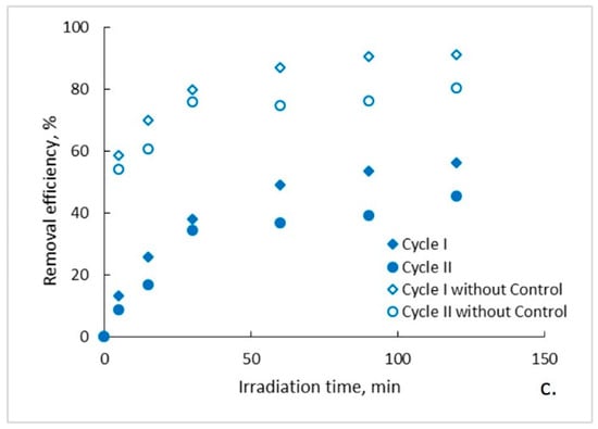 The evolution of the organic content of the aqueous solutions of ampicillin during the photocatalytic process is presented in Figure 2a–c. It can be observed that, regardless of the photocatalytic membranes used, after two hours of photocatalytic oxidation a complete mineralization of the aqueous solutions of ampicillin does not occur. Moreover, it seems that after a marked decrease of the organic content in the first 30 min of photocatalysis, its rate of degradation subsequently decreases significantly and tends to reach a plateau. This trend is specific to both photocatalytic cycles, with some differences regarding the degree of mineralization obtained after the two hours of irradiation. To explain this trend, the results obtained for the ampicillin solutions studied were plotted together with the results obtained for the control sample in which ampicillin was absent and fiberglass fabric plain woven-type membrane (EWR) was used (Figure 2a). It can be observed that the plateau, which tends to align the trend of the organic content of the photocatalyzed ampicillin samples after 30 min of irradiation, corresponds to the trend of the organic content of the control sample. It is also surprising that, in the absence of ampicillin, which theoretically represents the sole available source of organic material of the studied aqueous solutions, the organic content of the control sample is quite high even at low irradiation times. The organic content in the control sample most likely results from PLA degradation under the action of UV radiation. The similarity between the trend of the organic content of the ampicillin samples after 30 min of irradiation, with the trend of the organic content of the control sample, suggests that the mineralization of the ampicillin is almost completed after the first 30 min of irradiation, further slowly degrading the PLA from the photocatalytic membranes. If this is true, then the efficiency of removing the organic content due to ampicillin at the end of 30 min of irradiation should be much higher than that indicated by the obtained results. Figure 3 shows the removal efficiency of organic content for ampicillin samples calculated from the experimental results comparative with the removal efficiency of organic content for ampicillin samples from which the organic content attributed to PLA in the control sample was subtracted. It can be observed that the efficiency of removing the organic content after 30 min of irradiation for which the contribution of the PLA was taken into account is much higher than that for which it was not taken. For example, the efficiency of removing the organic content of the ampicillin samples after 30 min of irradiation in the presence of the fiberglass fabric plain woven-type membrane (EWR) is only about 52% (cycle I), while that for the ampicillin samples calculated taking into account the PLA contribution is about twice as big (Figure 3a). If the results obtained in the photocatalysis of the control sample in the presence of the fiberglass fabric plain woven-type membrane (EWR) are used to calculate the theoretical efficiency of removing of the organic content from the ampicillin samples photocatalized with the other two membranes, namely fiberglass mat-type membrane (EMC) (Figure 3b) and fiberglass fabric one fold edge-type membrane (TEX) (Figure 3c), approximately the same difference is recorded. A comparative analysis of removal efficiency of organic content of the ampicillin aqueous solution is shown in Table 2.