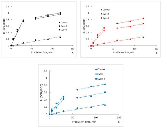 Pseudo-first order kinetic model was used to describe the photocatalytic degradation rate of ampicillin by plotting ln(C0/C) versus irradiation time for each photocatalytic membrane used []. The pseudo-first order kinetic model and its linearized form are presented in Equations (1) and (2):
