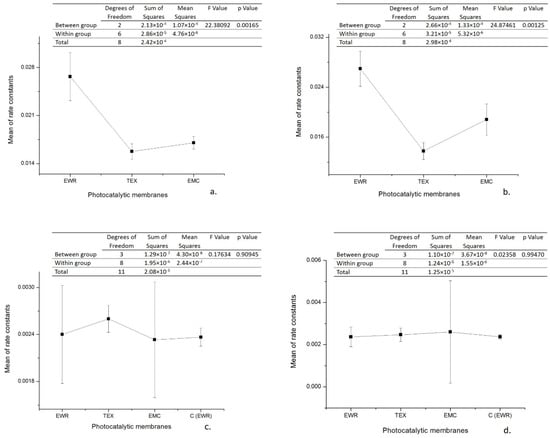 As can be seen, the initial rate calculated for the interval 0–30 min is, in all cases, with an order of magnitude greater than that calculated for the interval 30–120 min. Moreover, the observed pseudo-first order kinetic constant determined from the slope of the interval 30–120 min is in all cases approximately the same with observed pseudo-first order kinetic constant determined from the slope of entire interval (5–120 min) corresponding to the control sample (kobs = 0.0023 min−1). The kinetic parameters of photocatalytic degradation are presented in Table 3. The data were statistically analyzed with one-way analysis of variance (one-way ANOVA) at a significance level of α = 0.05 by using OriginPro 8 software. In order to establish which groups of data differ from each other, the means of the pseudo-first order kinetic constants were compared between them by conducting a Tukey post hoc test. The results obtained (Figure 5) highlight that for the interval 0–30 min the differences between the means of the pseudo-first order kinetic constants corresponding to the three types of photocatalytic membranes are statistically significant (p < 0.05), while for the interval 30–120 min the differences are not statistically significant (p > 0.05). It is worth noting that for the irradiation interval 30–120 the statistical analysis also included the data regarding the control test. Tukey post hoc test results confirm these findings. As an example, in Table 4 are presented the results obtained for data collected from experiments carried out in Cycle I. In this regard, it seems that there is a statistically significant difference in terms of means of the pseudo-first order kinetic constants for irradiation interval 0–30 min only between fiberglass fabric plain woven-type membrane (EWR) and fiberglass fabric one fold edge-type membrane (TEX), and also between fiberglass fabric plain woven-type membrane (EWR) and fiberglass mat-type membrane (EMC). Similar results were also obtained for data collected from experiments carried out in Cycle II (data not shown). These results are in agreement with the differences recorded between the photocatalytic membranes used in terms of the efficiency of organic material degradation (Figure 3 and Table 2). It should also be mentioned that the results of the statistical analysis confirm the hypothesis that at the beginning of the photocatalytic process, there are two available sources of organic material, namely ampicillin and the PLA deposited by the fiberglass support. Therefore, it is obvious that in the first 30 min of irradiation, ampicillin is almost completely degraded, further slowly degrading the PLA from the fiberglass support.