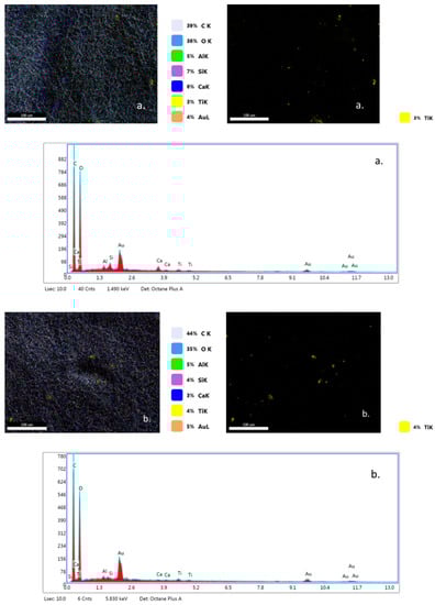 EDX analysis (Figure 7a–c) highlights that TiO2 nanoparticles were initially distributed randomly on the surface of the fibers (yellow color), due to the agglomeration of TiO2 nanoparticles onto the surface of hybrid PLA/TiO2 fiberglass membranes. After photocatalysis it is observed that all EDX spectra do not contain titanium (Ti), which may be a new evidence that shows the degradation of PLA during the photocatalytic process. If the PLA degrades during the photocatalytic process, then the TiO2 deposited on its nanofibers reaches the aqueous solution of ampicillin subjected to photocatalysis, forming a suspension whose concentration is likely to gradually decrease during the continuous recirculation of the working solution in the photocatalytic reactor. Also, the significant decrease in the carbon weight ratio (i.e., Figure 7d) may indicate the degradation of PLA.